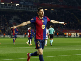 Ο Λεβαντόφσκι πανηγυρίζει το γκολ της Μπαρτσελόνα / REUTERS/Albert Gea ...
