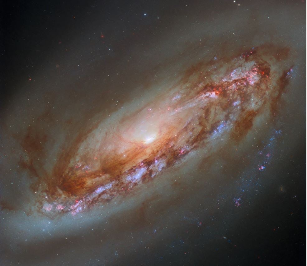 Οι εσωτερικές περιοχές του δίσκου του M90 είναι θέσεις σχηματισμού αστεριών, που φαίνονται στη νέα εικόνα με κόκκινο φως. Ο Μ90 βρίσκεται ανάμεσα στους γαλαξίες του σχετικά κοντινού σμήνος της Παρθένου και η τροχιά του οδήγησε τον Μ90 σε μια διαδρομή κοντά στο κέντρο του σμήνους πριν από περίπου τριακόσια εκατομμύρια χρόνια.