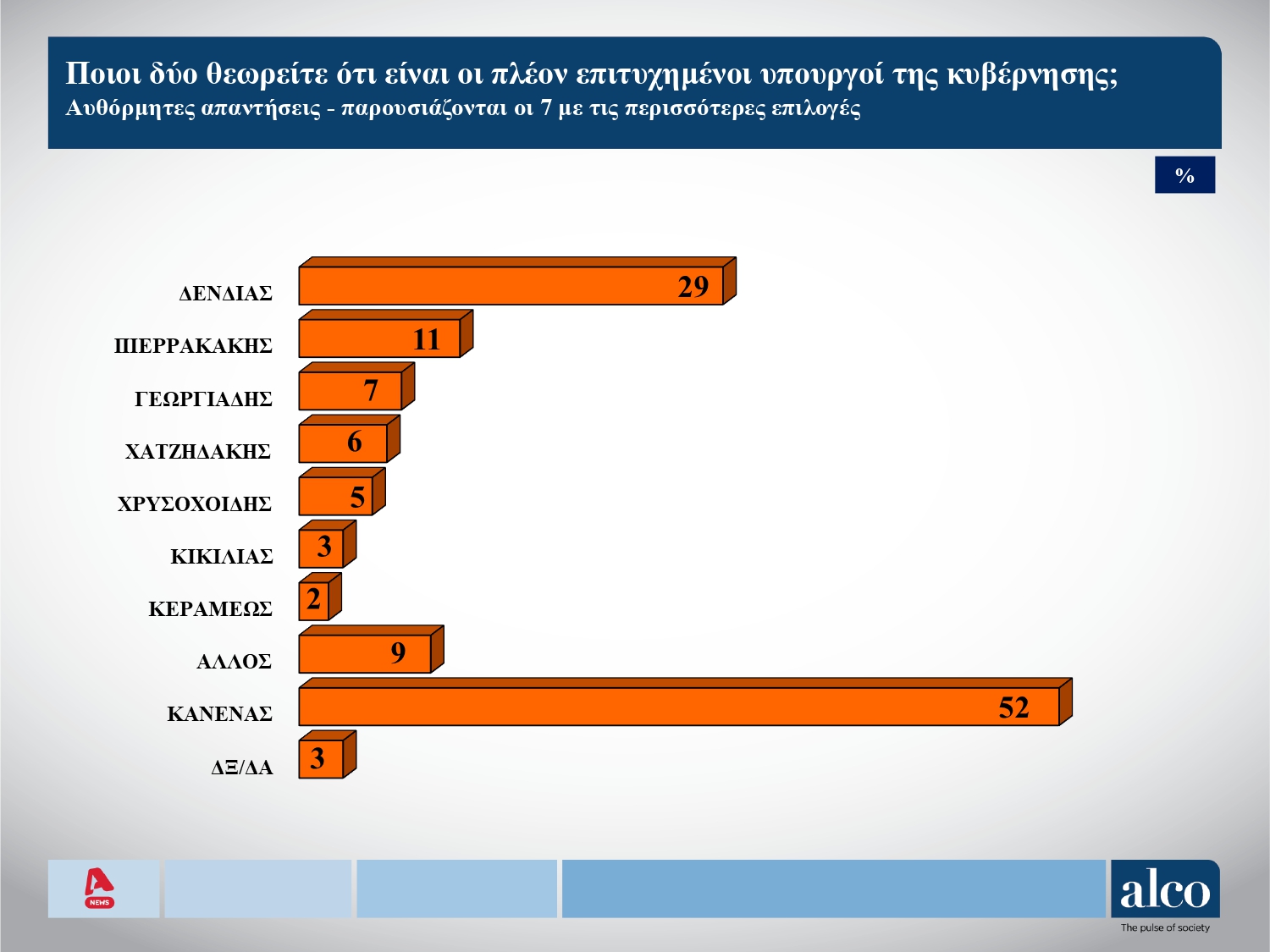 Στο δεύτερο μέρος της δημοσκόπησης της Alco (δείτε εδώ το πρώτο μέρος) για το κεντρικό δελτίο ειδήσεων του Alpha, καταγράφεται πως ο Νίκος Δένδιας είναι με διαφορά ο δημοφιλέστερος υπουργός της κυβέρνησης με ποσοστό 29% και ακολουθεί ο Κυριάκος Πιερρακάκης με 11%. Το κανένας πάντως συγκεντρώνει ποσοστό 52%.