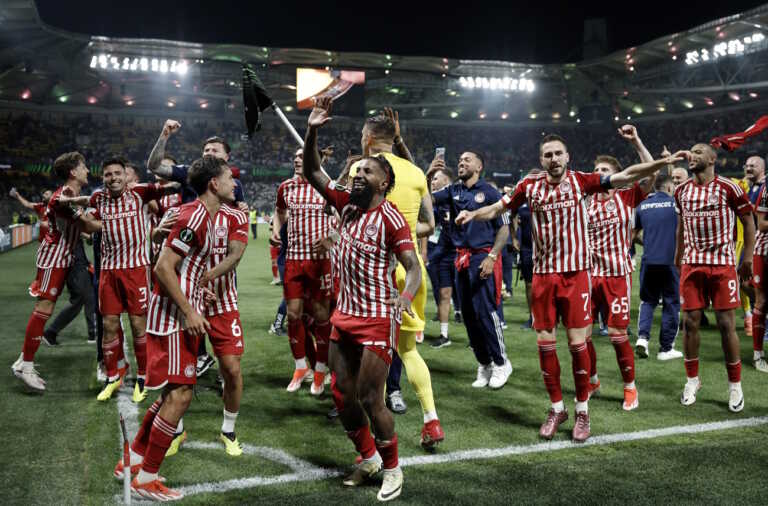 Ο Ολυμπιακός έγινε η πρώτη ομάδα που σηκώνει ευρωπαϊκό τρόπαιο. Το σφύριγμα της λήξης στον τελικό του Conference League, έδωσε το σύνθημα για να ξεκινήσουν οι πανηγυρισμοί.