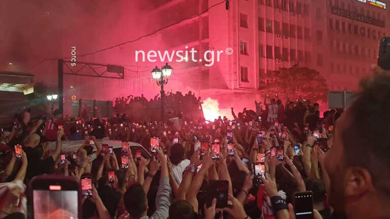 Νωρίτερα, η αποστολή του Ολυμπιακού έφτασε στις 4 το πρωί στη Λεωφόρο Συγγρού και συνοδεία των «τρελαμένων» φίλων του ξεκίνησε για το Δημοτικό Θέατρο Πειραιά.