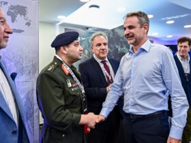 Ο πρωθυπουργός, Κυριάκος Μητσοτάκης ανταλλάσσει χειραψία με τον Αμερικανό ...