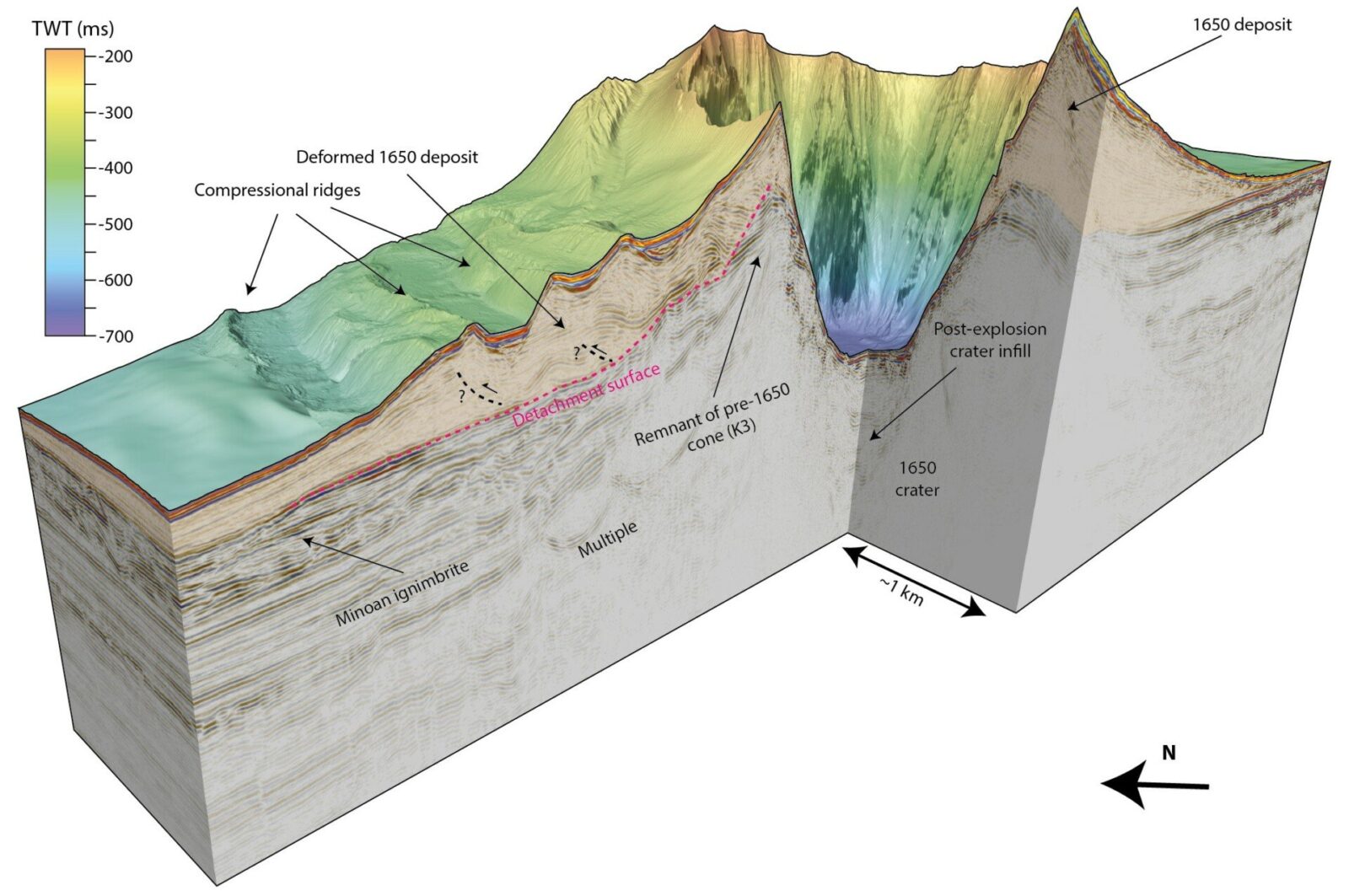 Η τρισδιάστατη απεικόνιση κατά τη συγκεκριμένη έρευνα κατέδειξε ότι ο κρατήρας είχε διάμετρο δυόμιση χιλιομέτρων και βάθος 500 μέτρων, γεγονός που υποδηλώνει μια πραγματικά μαζική έκρηξη, ενώ τα σεισμικά προφίλ αποκάλυψαν επίσης ότι η μία πλευρά του κώνου είχε παραμορφωθεί σοβαρά.