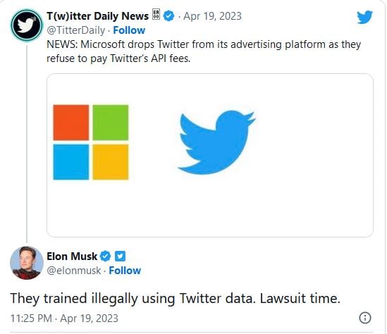 Με τον συνήθη του τρόπο, δηλαδή με μια ανάρτηση στο δικής του πλέον ιδιοκτησίας Twitter, ο Ελον Μασκ αποφάσισε να ανοίξει ένα ακόμη μέτωπο. «Ώρα για μήνυση στη Microsoft. Χρησιμοποίησε παράνομα δεδομένα του Twitter» έγραψε ο Μασκ λίγη ώρα μετά από την ανακοίνωση της Microsoft ότι από τις 25 Απριλίου το Twitter δεν θα βρίσκεται πλέον στη διαφημιστική της πλατφόρμα. Σύμφωνα με τον αμερικανό μεγιστάνα η Microsoft χρησιμοποίησε δεδομένα του Twitter για την ανάπτυξη τεχνολογίας τεχνητής νοημοσύνης. Ως γνωστόν η Microsoft είναι ο βασικός χρηματοδότης της εταιρείας Open AI που δημιούργησε και εξελίσσει το πρόγραμμα ChatGPT.