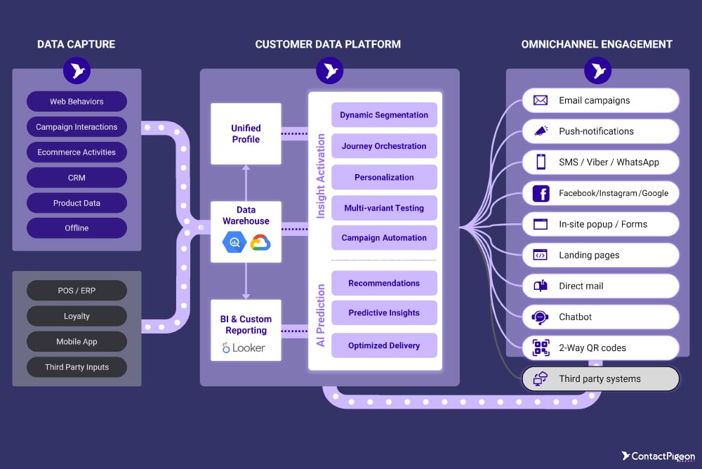 Επιπλέον, η ContactPigeon στηρίζει τους retailers δίνοντας τους ευελιξία και απόλυτο έλεγχο των δεδομένων τους σε κάθε βήμα. Δίνοντας προτεραιότητα στην ιδιοκτησία των first-party data, η πλατφόρμα επιτρέπει στους επιχειρηματίες να διαφυλάσσουν πολύτιμες πληροφορίες για τους πελάτες τους, από όλα τα σημεία επαφής (online/offline). Η πρωτοποριακή αρχιτεκτονική της διευκολύνει τη διασύνδεση με συστήματα ERP/CRM και εφαρμογές τρίτων, διασφαλίζοντας συνεκτική ροή δεδομένων και πληροφοριών σε όλο το οικοσύστημα των πωλήσεων. Ως εκ τούτου, η αδιάσπαστη σύνδεση των δεδομένων μεταφράζεται σε omnichannel επικοινωνία, επιτρέποντας στους retailers να παρέχουν εξατομικευμένες εμπειρίες που θα έχουν απήχηση σε κάθε κανάλι.