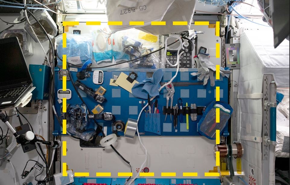 Φωτογραφία από μια περιοχή δειγματοληψίας στον χώρο εργασιών συντήρησης του Διεθνούς Διαστημικού Σταθμού (τετράγωνο 3). Στα δεξιά είναι ορατή κουκέτα πληρώματος. Η κίτρινη διακεκομμένη γραμμή υποδεικνύει τα όρια τα περιοχής δειγματοληψίας. πηγή φωτό: Walsh et al., 2024, PLOS ONE, CC-BY 4.0