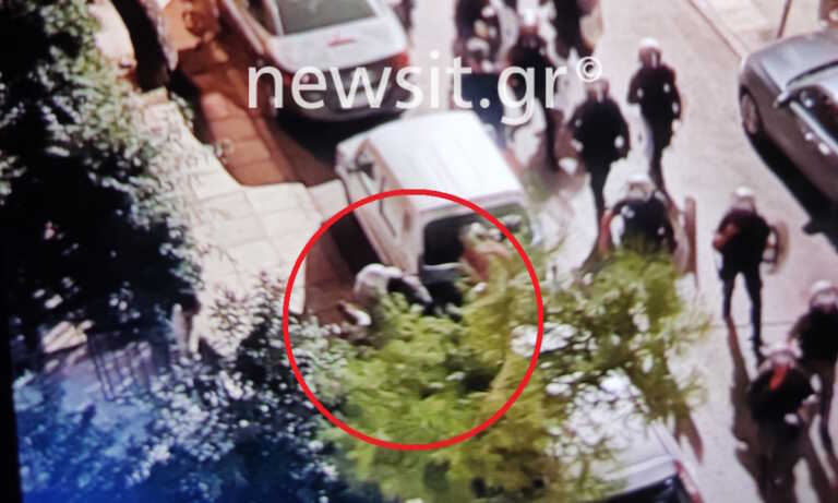 Σε φωτογραφία από το σημείο, διακρίνεται μια διμοιρία ΜΑΤ που περιφρουρούσε το σημείο ώσπου να έρθει το ασθενοφόρο του ΕΚΑΒ.