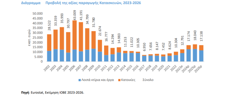 Σύμφωνα με τις εκτιμήσεις της μελέτης του ΙΟΒΕ, το σύνολο των εργαζόμενων στις Κατασκευές, εφόσον συνεχιστεί η ανοδική πορεία του κλάδου, θα πρέπει να αυξηθεί την περίοδο 2024-2026 σε περίπου 250 χιλ. εργαζόμενους, επίπεδο που είναι κατά 51 έως 55 χιλ. εργαζόμενους υψηλότερο σε σύγκριση με το σύνολο της απασχόλησης στις Κατασκευές το 2022 (197 χιλ. εργαζόμενοι) (Διάγραμμα). Εαν λάβουμε υπόψη μας και τους έμεσα απασχολούμενους σε εμπορικές επιχειρήσεις και σε υπηρεσίες που αφορούν στον κατασκευαστικό κλάδο τα νούμερα είναι πολλαπλάσια.