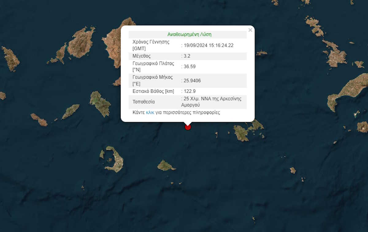 Το επίκεντρο του σεισμού των 3,2 βαθμών της κλίμακας Ρίχτερ εντοπίζεται σε απόσταση 25 χιλιομέτρων νότια – νοτιοανατολικά της Αρκεσίνης Αμοργού.