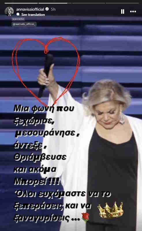 «Μια φωνή που ξεχώρισε, μεσουράνησε, άντεξε και ακόμα μπορεί!!! Όλοι ευχόμαστε να το ξεπεράσεις και να ξαναγυρίσεις», έγραψε η Άννα Βίσση: