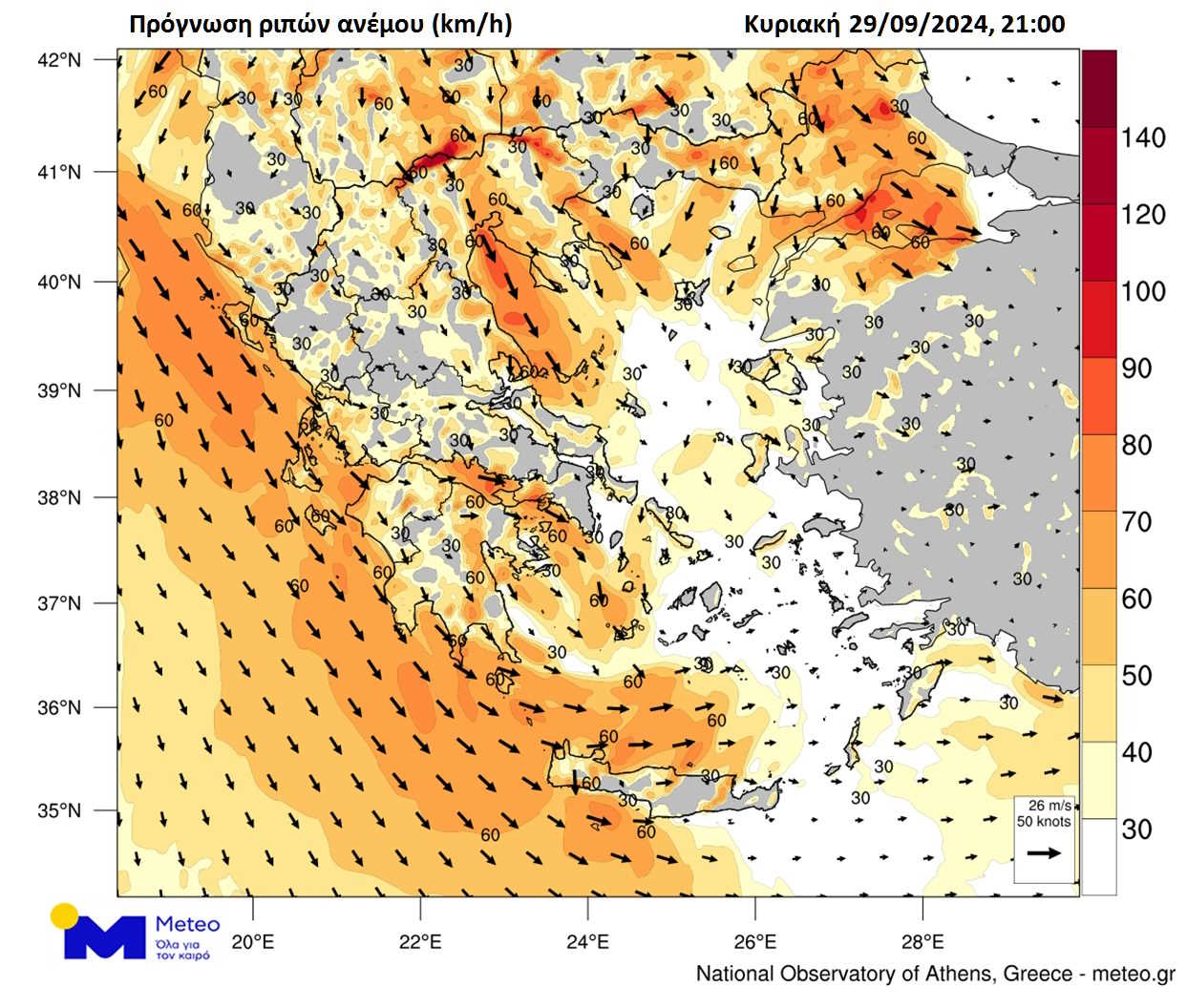 Στην ομάδα χαρτών που ακολουθεί παρουσιάζεται η πρόγνωση για τις ριπές του ανέμου από το βράδυ της Κυριακής 29/09 έως το πρωί της Δευτέρας 30/09. Όπως φαίνεται, το βράδυ της Κυριακής (21:00) αναμένονται ΡΙΠΕΣ ΑΝΕΜΟΥ που τοπικά θα ξεπερνούν τα 70 – 80 km/h, ενώ κατά τη διάρκεια της νύχτας (03:00) και το πρωί της Δευτέρας (09:00), αναμένονται ΡΙΠΕΣ ΑΝΕΜΟΥ που τοπικά θα ξεπερνούν τα 90 km/h.
