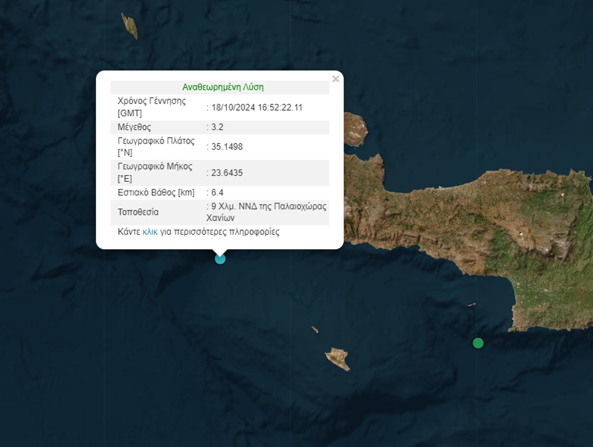 Σεισμός ύψους 3,2 Ρίχτερ έγινε πριν από λίγη ώρα, σήμερα το απόγευμα (18.10.2024), στην Κρήτη και συγκεκριμένα νότια των Χανίων.