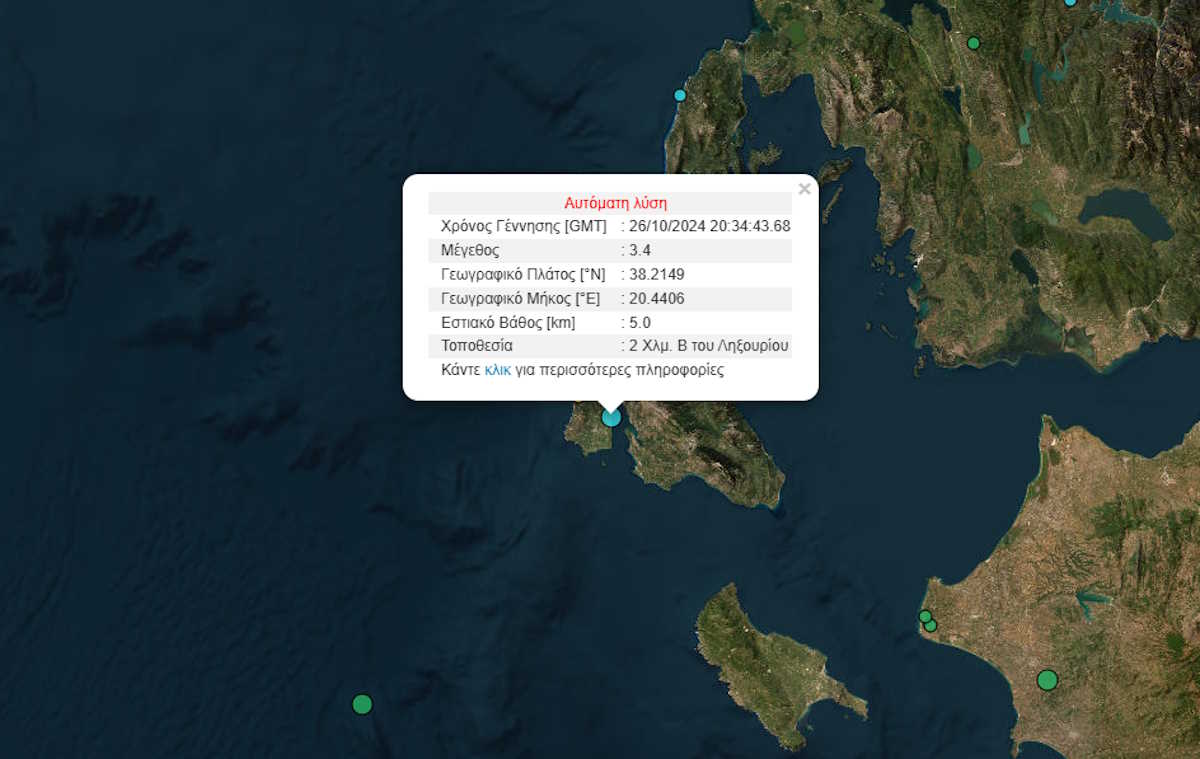 Σεισμός μεγέθους 3,4 βαθμών της κλίμακας Ρίχτερ σημειώθηκε στην Κεφαλονιά, στις 23:34 το βράδυ του Σαββάτου (26.10.2024).