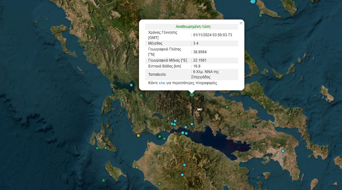 Σεισμός μεγέθους 3,4 βαθμών της κλίμακας Ρίχτερ σημειώθηκε στις 05:50 νωρίς το πρωί σήμερα (01.11.24) στη Σπερχειάδα, Φθιώτιδας.