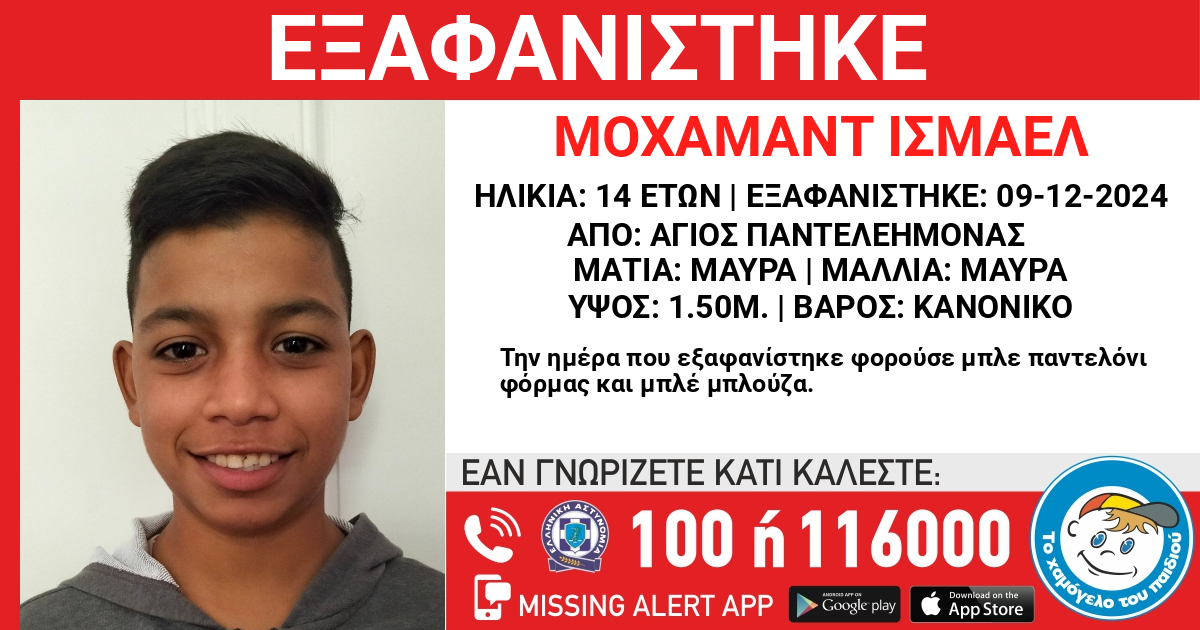 Στις 09/12/2024, μεσημεριανές ώρες, εξαφανίστηκε από χώρο φιλοξενίας στον Άγιο Παντελεήμονα, ο Μοχάμαντ (ον) Ισμαέλ (επ.), 14 ετών, Αιγυπτιακής καταγωγής. «Το Χαμόγελο του Παιδιού ενημερώθηκε σήμερα 10/12/2024 για την εξαφάνιση του ανήλικου και κατόπιν εισαγγελικής εντολής προχώρησε άμεσα στη δημοσιοποίηση των στοιχείων του, καθώς συντρέχουν λόγοι που θέτουν την ζωή του σε κίνδυνο.