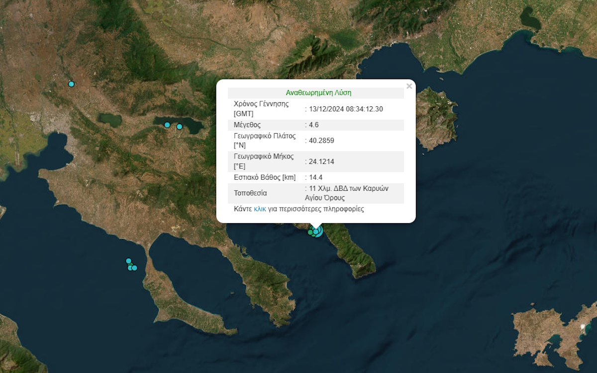 Σεισμός σημειώθηκε στις 10:34 το πρωί της Παρασκευής (13.12.2024) στο Άγιο Όρος.