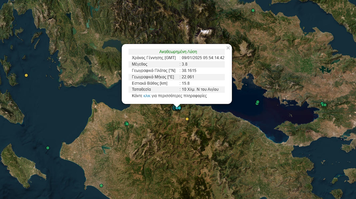 Στις 7:54 σημειώθηκε σεισμός στο Αίγιο μεγέθους 3,8 Ρίχτερ, σύμφωνα με την αναθεωρημένη ανάλυση του Γεωδυναμικού Ινστιτούτου.