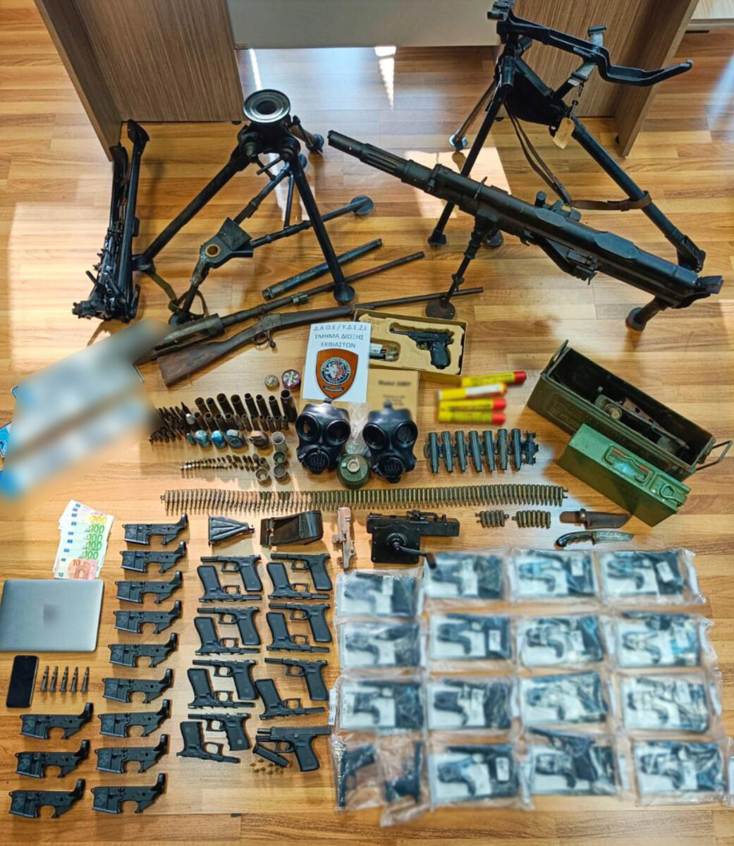 Πολυβόλο όπλο, κάνη πολυβόλου όπλου, 4 μεταλλικές βάσεις πολυβόλου όπλου, 2 μεταλλικά τμήματα πολυβόλου όπλου, κουτί με μεταλλικά τμήματα πολυβόλου όπλου, 2 χειροβομβίδες, καραμπίνα με ξύλινη λαβή, πιστόλι αερίου, 5 αμπούλες αερίου και πλήθος μεταλλικών σφαιριδίων, 2 τρίφτες με υπολείμματα κάνναβης, μαχαίρι συνολικού μήκους 25 εκατοστών, με μήκος λάμας 13 εκατοστά, μεταλλικό μέρος όπλου, 194 κάλυκες, 10 βολίδες πυροβόλων όπλων και 5 φυσίγγια διαφόρων διαμετρημάτων, 2 οπλοβομβίδες, 4 καπνογόνα, 2 μάσκες αερίου με τρία φίλτρα, κινητό τηλέφωνο και φορητός υπολογιστής.