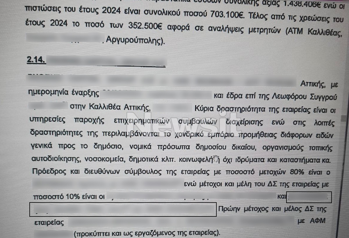 Όπως χαρακτηριστικά αναφέρεται στο πόρισμα του προέδρου της Αρχής Καταπολέμησης της Νομιμοποίησης Εσόδων από Εγκληματικές Δραστηριότητες κ. Χαράλαμπου Βουρλιώτη «η εταιρεία (σ.σ αναφέρεται το όνομα της) με ΑΦΜ ….- ΔΟΥ ΚΕΦΟΔΕ Αττικης με ημερομηνία έναρξης 23- 2-2024, κεφάλαιο 30.000 ευρώ και έδρα τη λεωφόρο Συγγρού. Κύρια δραστηριότητα της εταιρείας είναι υπηρεσίες παροχής επιχειρηματικών συμβουλών διαχείρισης, ενώ στις λοιπές δραστηριότητες περιλαμβάνεται το χονδρικό εμπόριο προμήθειας διαφόρων ειδών γενικά προς το Δημόσιο, νομικά πρόσωπα δημοσίου δικαίου, οργανισμούς τοπικής αυτοδιοίκησης, νοσοκομεία, δημοτικά κλπ κοινωφελή ή όχι ιδρύματα και καταστήματα. Πρόεδρος και διευθύνων σύμβουλος της εταιρείας με ποσοστό 80% ειναι ο (σ.σ αναφέρει το όνομα ενος εκ των συλληφθέντων) ενώ μέτοχοι και μέλη του Δ.Σ της εταιρείας με ποσοστο 10% είναι οι (σ.σ αναφέρει το όνομα ενός άλλου συλληφθέντα και δευτερο πρόσωπο με το υπόλοιπο 10% το όνομα του γνωστού ηθοποιού). Πρώην μέτοχος και μέλος όνομα του γνωστού ηθοποιού). Πρώην μέτοχος και μέλος του Δ.Σ, ήταν ο (σ.σ αναφέρει το όνομα ενος άλλου συλληφθέντα)».
