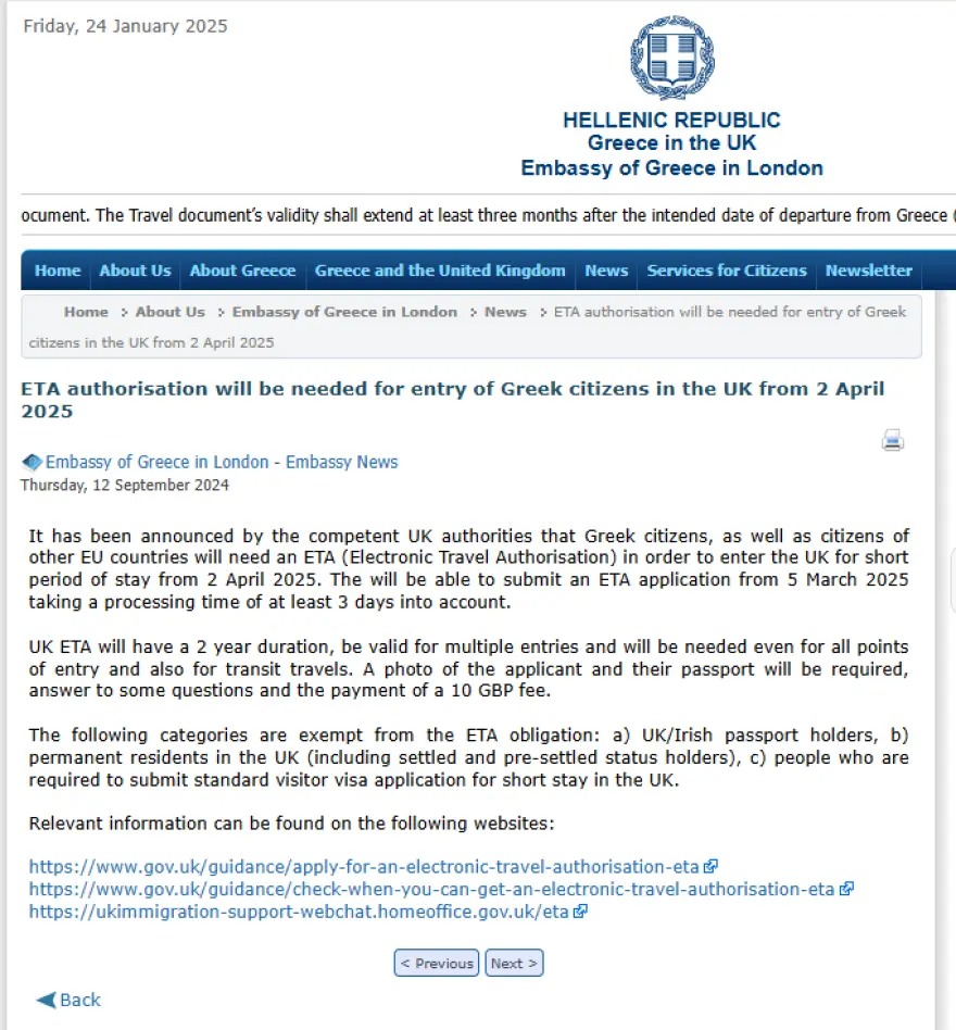 Στις 12 Σεπτεμβρίου 2024 το ελληνικό υπουργείο Εξωτερικών είχε εκδώσει σχετική ανακοίνωση, σύμφωνα με την οποία «οι Έλληνες πολίτες, καθώς και οι πολίτες άλλων χωρών της ΕΕ, θα χρειάζονται ETA (Electronic Travel Authorisation) για να εισέλθουν στο Ηνωμένο Βασίλειο για σύντομο χρονικό διάστημα διαμονής από τις 2 Απριλίου 2025».