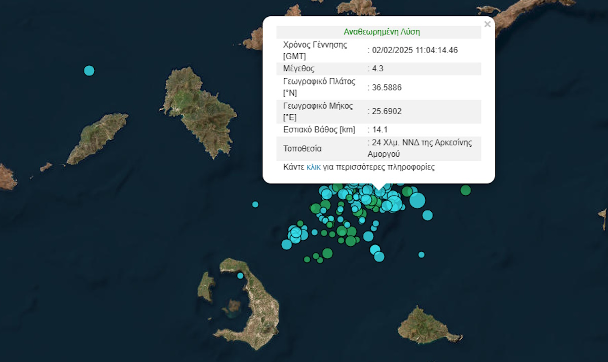 Ο τελευταίος σεισμός των 4,3 Ρίχτερ είχε εστιακό βάθος στα 12,5 χλμ, ενώ για ακόμη μια φορά το επίκεντρο ήταν στην ίδια περιοχή και συγκεκριμένα 20 χλμ νοτιοδυτικά της Αρκεσίνης Αμοργού.