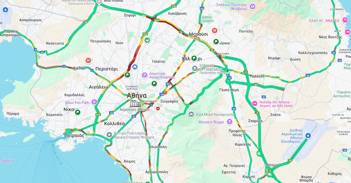 Σοβαρά είναι τα προβλήματα και στην Αττική Οδό. Αυτή τη στιγμή, στο ρεύμα προς αεροδρόμιο καταγράφονται καθυστερήσεις από 20 έως 25 λεπτών από τον κόμβο της Μεταμόρφωσης έως τον κόμβο της Κηφισίας.