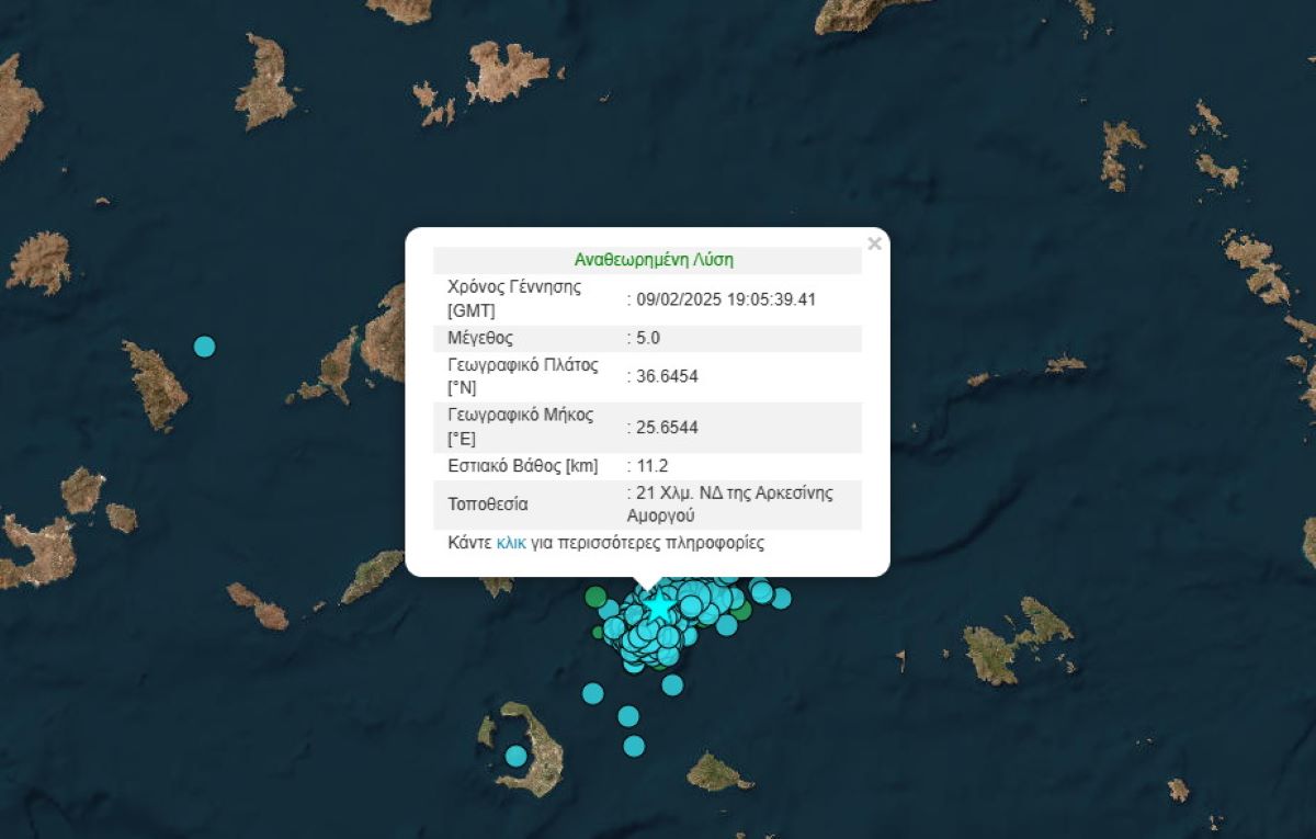 Συγκεκριμένα, στις 13:54 καταγράφηκε σεισμός 4,1 βαθμών της κλίμακας Ρίχτερ 19 χιλιόμετρα νότιο, νοτιοδυτικά της Αρκεσίνης Αμοργού.