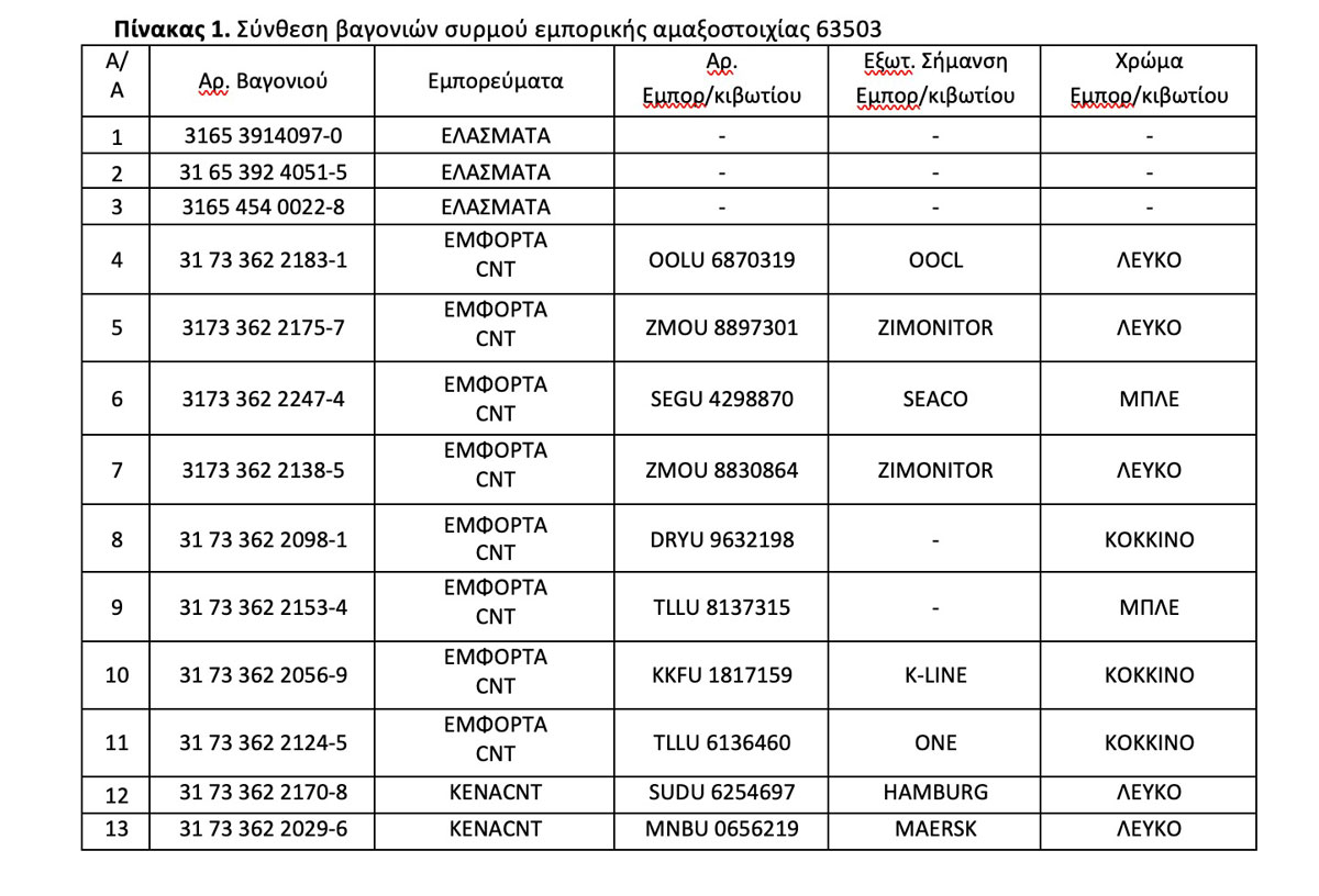 «Η εμπορική αμαξοστοιχία αποτελούνταν από 2 εν σειρά ηλεκτράμαξες σε ζεύξη διπλής έλξης (κατά σειρά Η/Α 1 120-022 και Η/Α 2 120-012) και 13 φορτάμαξες (πλατφόρμες) με σύνθεση», αναφέρουν οι πραγματογνώμονες και παραθέτουν τα στοιχεία που τους χορηγήθηκαν από την Hellenic Train.