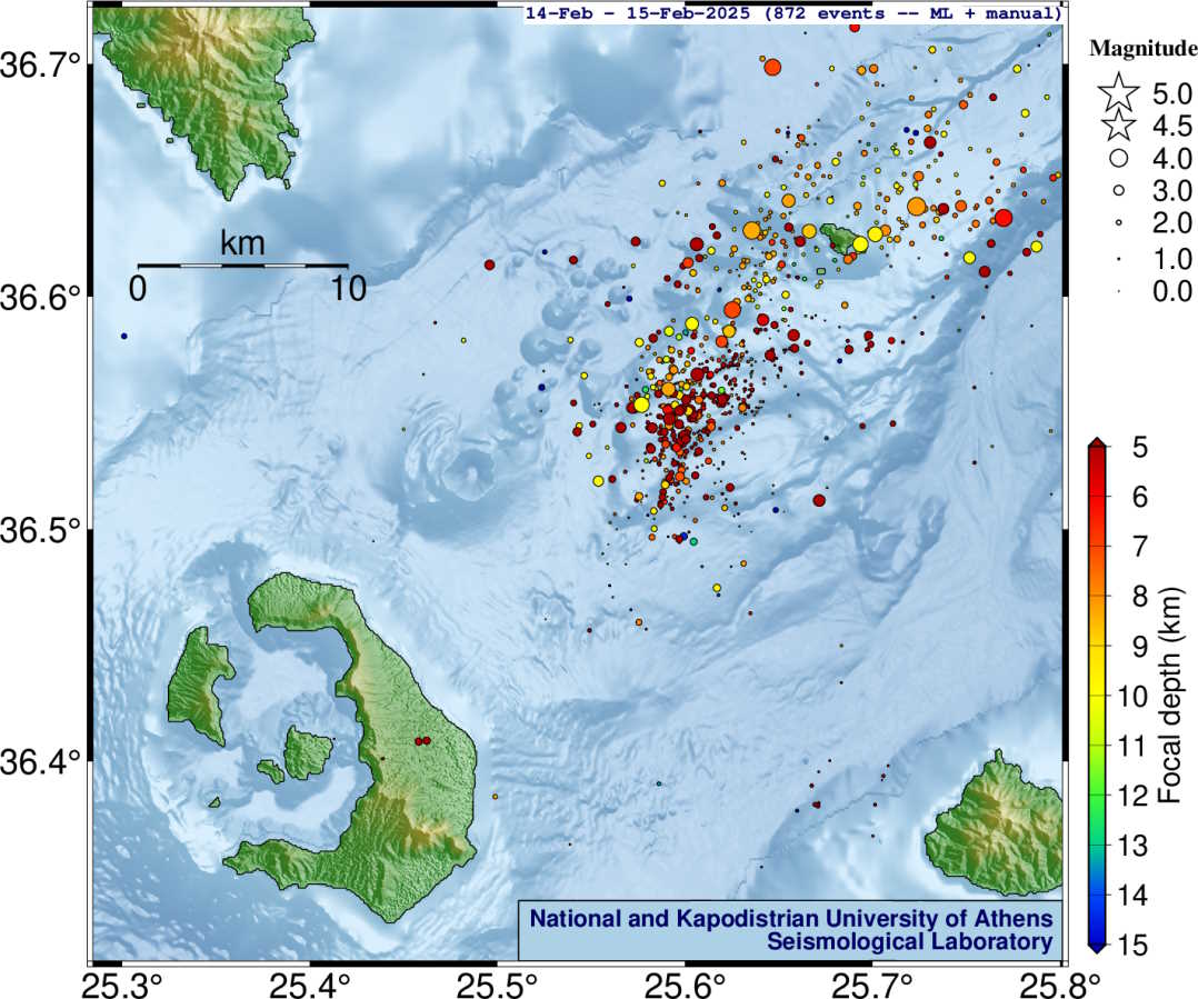 Σύμφωνα με τα στοιχεία καθημερινής ανάλυσης σεισμικών δεδομένων (χωρίς χρήση μεθόδων μηχανικής μάθησης) του Εργαστηρίου Σεισμολογίας του ΕΚΠΑ, στις 15 Φεβρουαρίου έχουν καταγραφεί 94 σεισμοί, ενώ οι ισχυρότεροι σημειώθηκαν στις 05:37:43 και 09:12:50 (τοπική ώρα) και είχαν μέγεθος 3,9R.