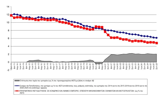 Τα στοιχεία της μελέτης είναι αποκαλυπτικά. Το εμπόριο έχει υποχωρήσει από το 10,1% του ΑΕΠ το 2017 στο 4,9% το 2025, ενώ η βιομηχανία από το 10,4% στο 6%. Οι δύο κλάδοι καταγράφουν ασταθείς ρυθμούς πιστωτικής επέκτασης, με έντονες διακυμάνσεις και συχνά αρνητικές επιδόσεις. Το 2021, εν μέσω πανδημίας, η βιομηχανία μειώθηκε κατά -18% και το εμπόριο κατά -22,3%. Ακόμη και μετά την επανεκκίνηση της οικονομίας, η ανάκαμψη δεν ήταν σταθερή: το 2023 και το 2024 και οι δύο κλάδοι επέστρεψαν σε αρνητικό έδαφος.