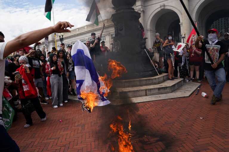 Χιλιάδες διαδηλωτές κατά του πολέμου του Ισραήλ στη Λωρίδα της Γάζας, ορισμένοι κρατώντας σημαίες της Παλαιστίνης, συγκεντρώθηκαν κοντά στο Καπιτώλιο πριν από την ομιλία του Ισραηλινού πρωθυπουργού Μπενιαμίν Νετανιάχου στο Κογκρέσο.
