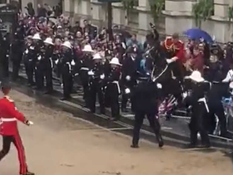 Ο κόσμος φαίνεται να κάνει στην άκρη και να προσπαθεί να αποφύγει το ταραγμένο άλογο, ενώ ο αναβάτης του τραβάει τα χαλινάρια για να το ηρεμήσει και να το ελέγξει. Αν και κανείς δεν φάνηκε να ποδοπατήθηκε, στο τέλος του βίντεο ένας από τους στρατιώτες φαίνεται να κουτσαίνει…