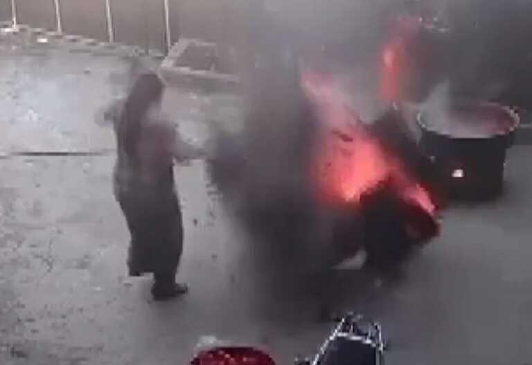 Λίγα δευτερόλεπτα μετά, το ένα καζάνι εξερράγη και εκτοξεύεται από τη φωτιά, ευτυχώς προς την αντίθετη κατεύθυνση των γυναικών.