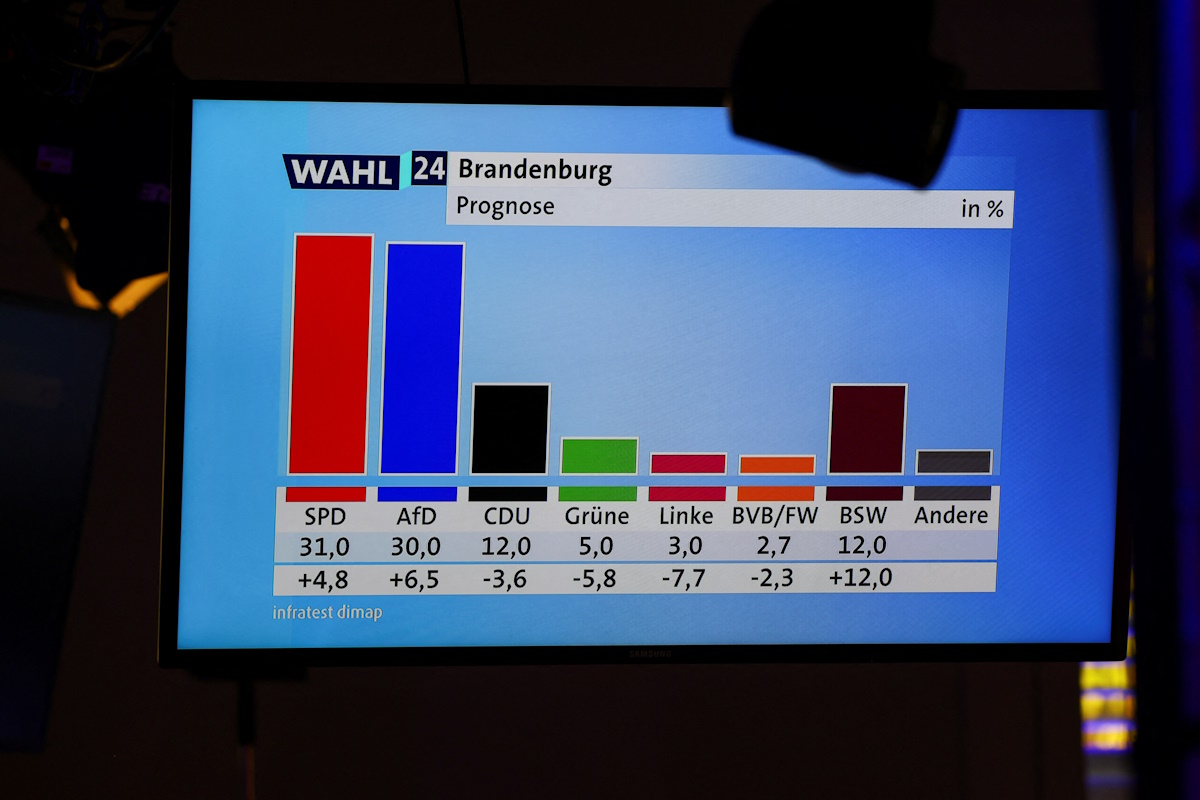 Η πρόβλεψη αποτελέσματος του πρώτου καναλιού της γερμανικής δημόσιας τηλεόρασης ARD για τις εκλογές στο Βρανδεμβούργο, δίνει ανατροπή των δημοσκοπήσεων.