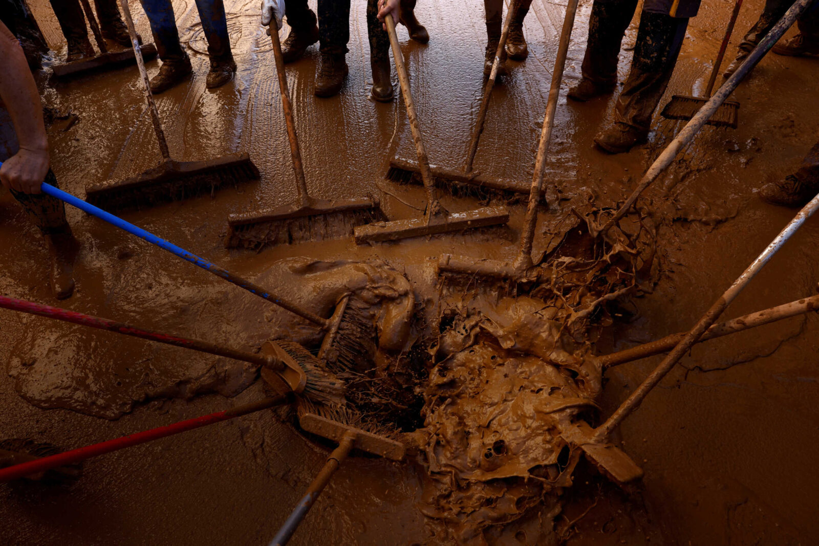 Χιλιάδες εργάτες καθαρίζουν κτίρια, απομακρύνοντας τη λάσπη που έχει συσσωρευτεί στους δρόμους και τα πεζοδρόμια και τους βουλωμένους αγωγούς του δικτύου αποχέτευσης σε πόλεις και στα προάστια της Βαλένθια.