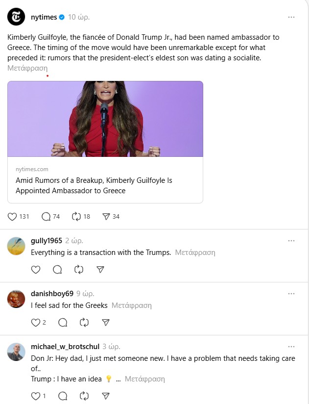Η Κίμπερλι Γκιλφόιλ ετοιμάζει βαλίτσες για την Αθήνα, όπου θα αντικαταστήσει τον Τζορτζ Τσούνη στην πρεσβεία των ΗΠΑ, σε μία επιλογή του Τραμπ, την οποία πολλοί στις ΗΠΑ σχολιάζουν ως «δώρο» για τον χωρισμό της από τον γιο του, Ντόναλντ Τραμπ Τζούνιορ.
