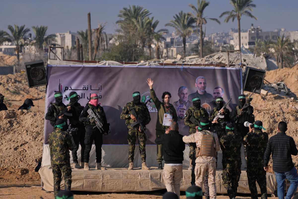 Τον έβαλαν να σταθεί μπροστά σε μια αφίσα που δείχνει δολοφονημένους ηγέτες της Χαμάς, συμπεριλαμβανομένου του Μοχάμεντ Ντέιφ, του στρατιωτικού ηγέτη που η Χαμάς ανακοίνωσε τον θάνατό του αυτή την εβδομάδα. Η τελετή ήταν σύντομη και προσεκτικά σκηνοθετημένη από τη Χαμάς, χωρίς τα μεγάλα πλήθη και το σκηνικό χάους που σημάδεψε την απελευθέρωση την Πέμπτη των Αγκάμ Μπέργκερ και Γκάντι Μόζες. Το Ισραήλ επέμεινε σε εγγυήσεις από τους μεσολαβητές ότι οι μελλοντικές παραδόσεις θα είναι ήρεμες.
