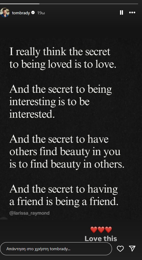 Ο θρύλος του NFL μοιράστηκε στα Instagram Stories του, ένα απόσπασμα σε μαύρο φόντο για το «μυστικό για να σε αγαπούν».