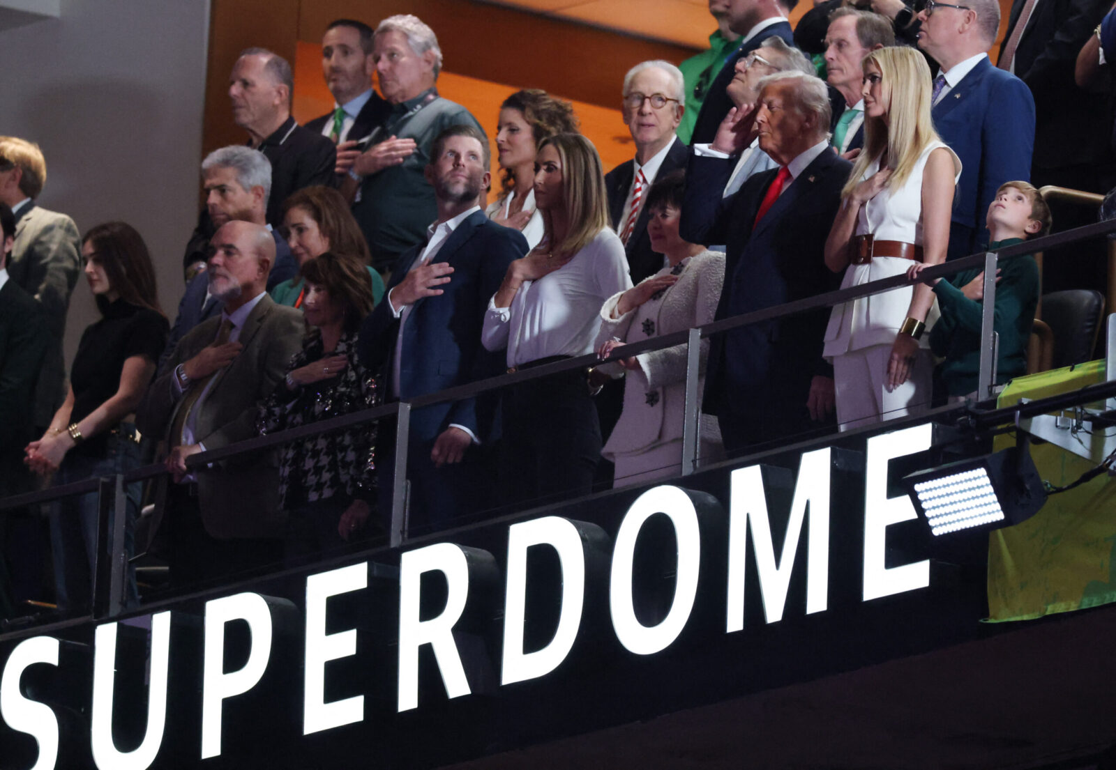 Ο Τραμπ κάθισε κοντά στην κόρη του Ιβάνκα Τραμπ, ενώ χαιρέτησε στρατιωτικά κατά τη διάρκεια του Εθνικού Ύμνου στις οθόνες του γηπέδου.