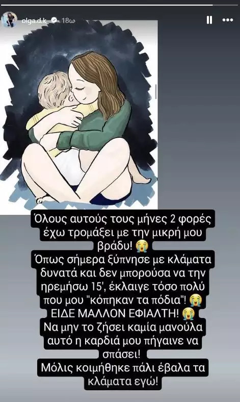 «Μόλις κοιμήθηκε πάλι έβαλα τα κλάματα εγώ!», κατέληξε η Όλγα Κιουρτσάκη.