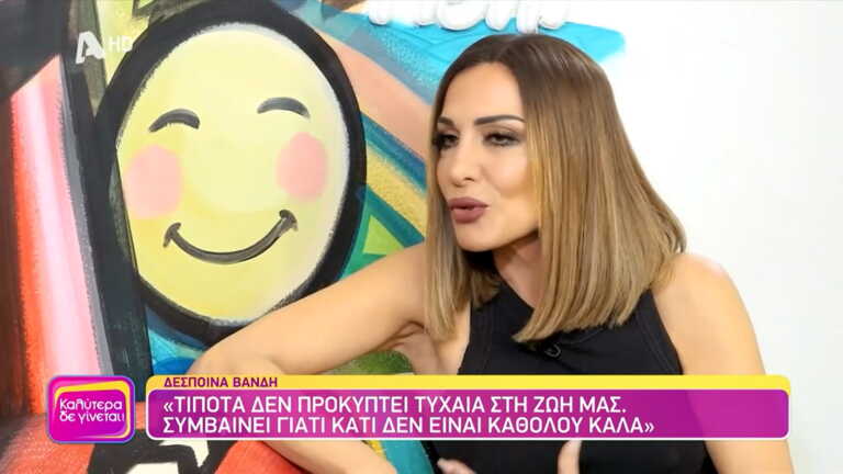 Η Δέσποινα Βανδή έδωσε συνέντευξη στην εκπομπή «Καλύτερα Δε Γίνεται» και μίλησε για τη σχέση της με τον Βασίλη Μπισμπίκη ενώ σχολίασε όσα ακούγονται για αυτή, λέγοντας ότι «είμαι ένας ευτυχισμένος άνθρωπος» και ότι «το τι άποψη μπορεί να έχει ο καθένας, δεν με αφορά καθόλου. Δεν κοιμάμαι κάθε βράδυ με την άποψη του καθένα, αλλά σε μια αγκαλιά».