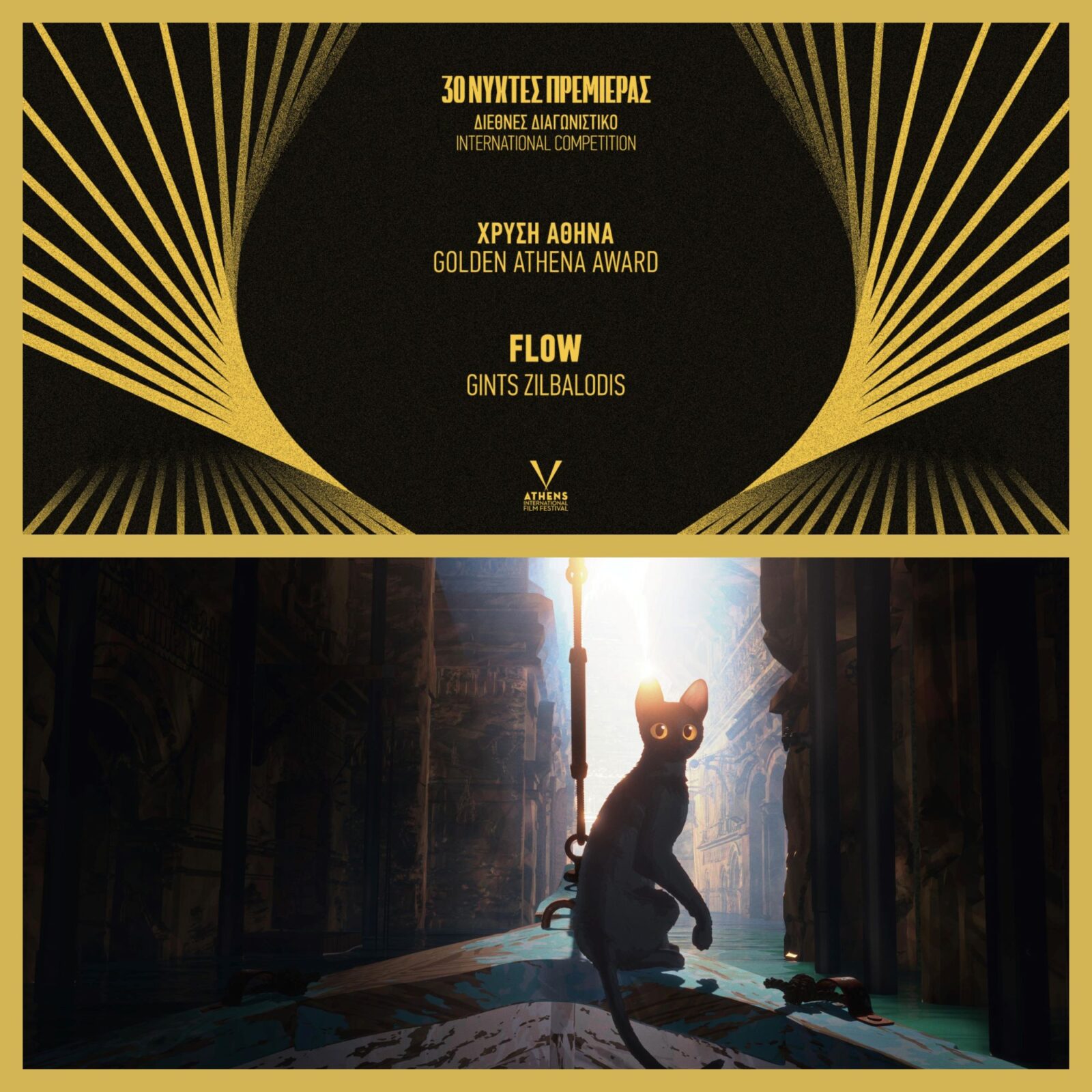 Η ταινία κινουμένων σχεδίων «Flow» του Γκιντς Ζιλμπαλόντις κέρδισε τη Χρυσή Αθηνά Καλύτερης Ταινίας και το βραβείο κοινού στο 30ο Διεθνές Φεστιβάλ Κινηματογράφου της Αθήνας «Νύχτες Πρεμιέρας», που ολοκληρώθηκε χθες με την απονομή των βραβείων και την προβολή της ταινίας «Το Διπλανό Δωμάτιο» του Πέδρο Αλμοδόβαρ, η οποία κέρδισε το Χρυσό Λιοντάρι στο φετινό Φεστιβάλ Βενετίας.