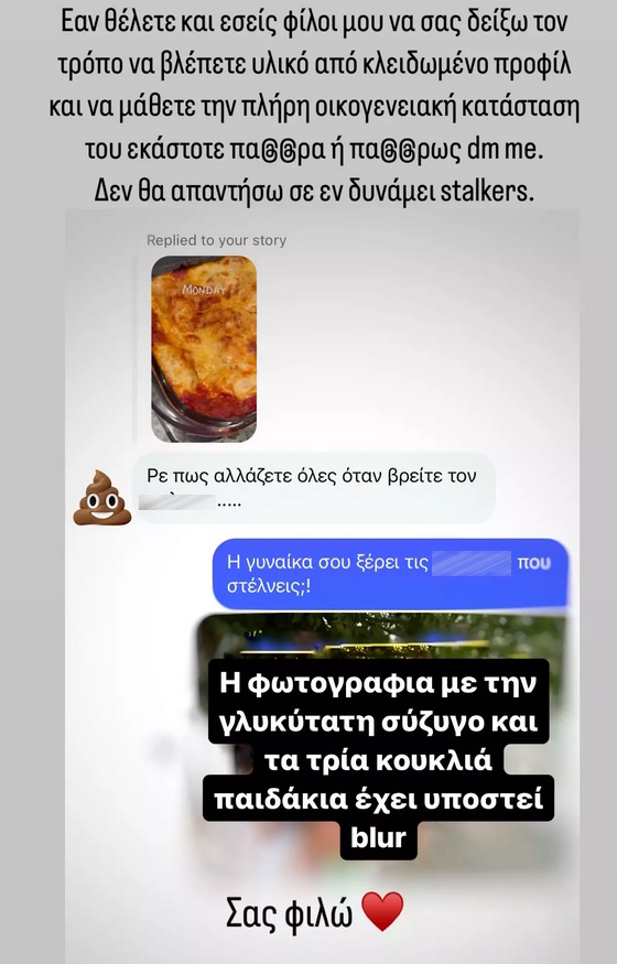 Εάν θέλετε και εσείς φίλοι μου να σας δείξω τον τρόπο να βλέπετε υλικό από κλειδωμένο προφίλ και να μάθετε την πλήρη οικογενειακή κατάσταση του εκάστοτε πα@@α ή πα@@@ως dm me. Δεν θα απαντήσω σε εν δυνάμει stalkers. Η φωτογραφία με την γλυκύτατη σύζυγο και τα τρία κουκλιά παιδιά έχει υποστεί blur. Σας φιλώ» έγραψε η Νικολέττα Ράλλη.