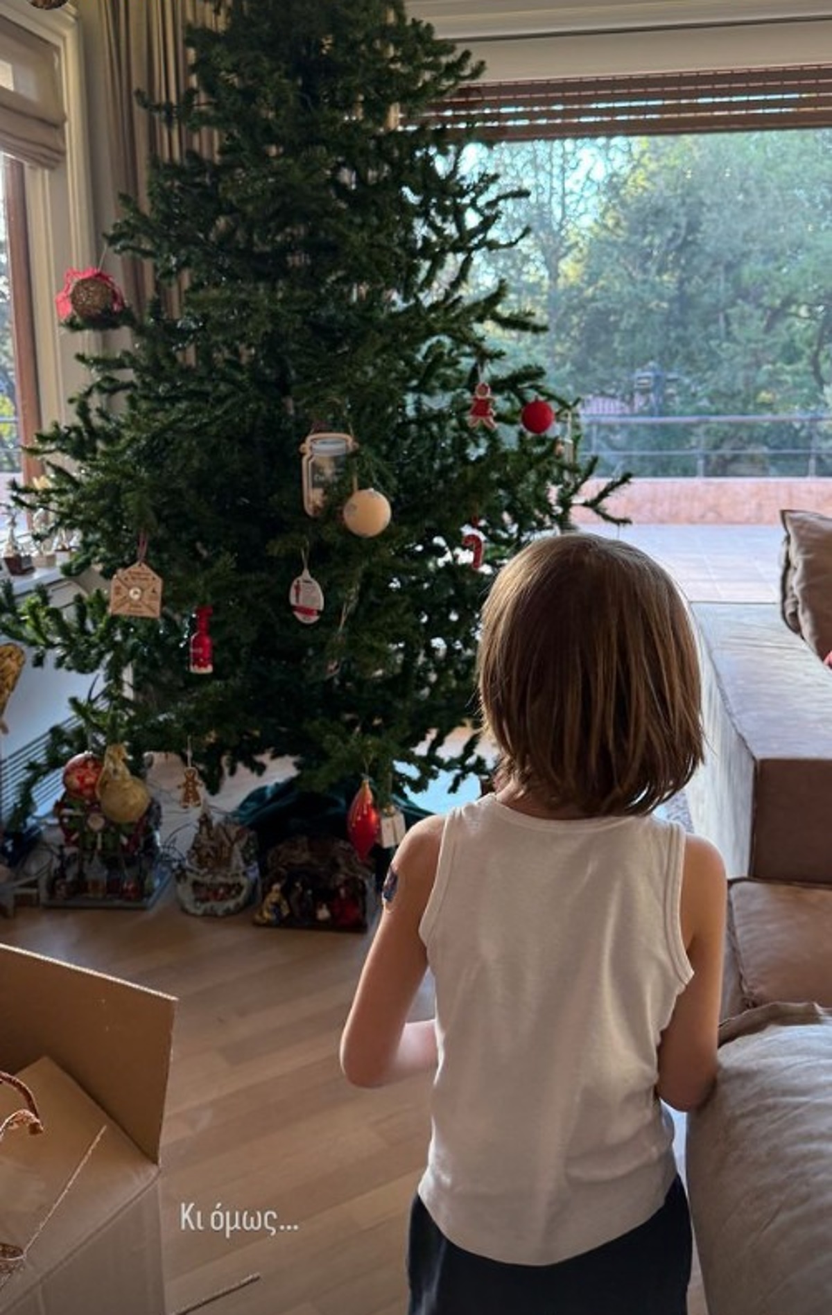 Στη μία φωτογραφία φαίνεται το χριστουγεννιάτικο δέντρο με 4-5 στολίδια, που βρίσκεται μπροστά από τον 6χρονο γιο που έχει αποκτήσει με τον σύζυγό της Δημήτρη Θεοδωρίδη, τον Σάββα.