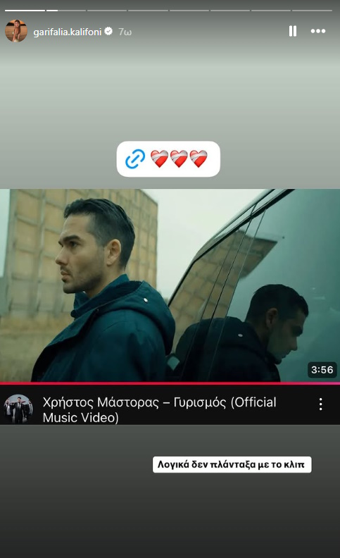 Το νεαρό μοντέλο, ανέβασε μια φωτογραφία από το νέο τραγούδι του Χρήστου Μάστορα και αποκάλυψε πως μόλις το είδε πλάνταξε στο κλάμα. Η Γαρυφαλλιά Καληφώνη μάλιστα, αποκάλυψε ότι έκλαψε κατά τη διάρκεια του βίντεο κλιπ.