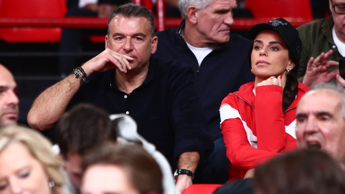 Ο Γιώργος Λιάγκας και η Μαρία Αντωνά βλέπουν τον αγώνα Ολυμπιακός – Βίρτους Μπολόνια, με τον φωτογραφικό φακό να τους εντοπίζει στις εξέδρες του γηπέδου και να τους απαθανατίζει.