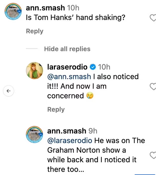 «Τρέμει το χέρι του Τομ Χανκς;», έγραψε ένας χρήστης στα social media με έναν άλλο να προσθέτει: «Το παρατήρησα κι εγώ!!! Και τώρα ανησυχώ.