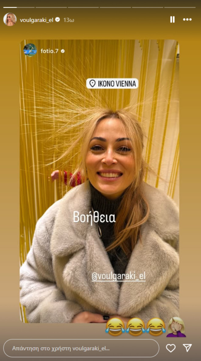 Πέρα από τα μέρη που επισκέφτηκε, το ζευγάρι “εμφάνισε” στους followers του και μια αρκετά αστεία στιγμή των διακοπών του. Σε ένα από τα stories που δημοσίευσε ο Φώτης Ιωαννίδης, η Ελένη Βουλγαράκη εμφανίζεται να ποζάρει, έχοντας με ηλεκτρισμένο μαλλί.