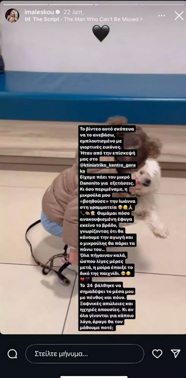 «Το βίντεο αυτό σκόπευα να το ανεβάσω, εμπλουτισμένο με γιορτινές εικόνες. Ήταν από την επίσκεψή μας στο κτηνιατρικό κέντρο. Είχαμε πάει τον μικρό Danonito για εξετάσεις. Κι όσο περιμέναμε, η μικρούλα μου, “βοηθούσε” την Ιωάννα στη γραμματεία. Θυμάμαι πόσο ανακουφισμένη έφυγα εκείνο το βράδυ, γνωρίζοντας ότι θα κάνουμε την αγωγή και ο μικρούλης θα πάρει τα πάνω του…
