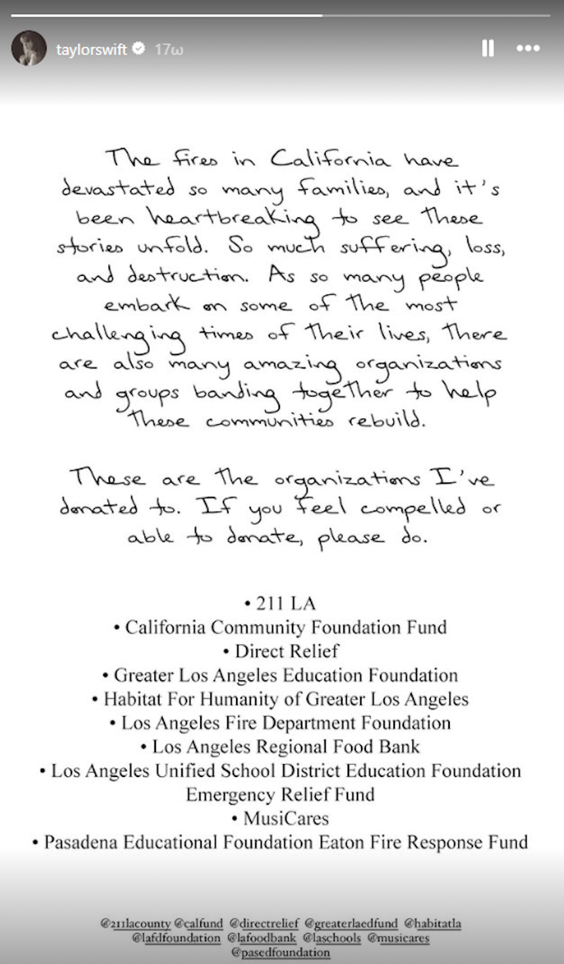 «Οι πυρκαγιές στην Καλιφόρνια έχουν καταστρέψει τόσες πολλές οικογένειες και είναι αποκαρδιωτικό να βλέπουμε αυτές τις ιστορίες να εκτυλίσσονται» έγραψε η Αμερικανίδα σούπερ σταρ της ποπ, Τέιλορ Σουίφτ σε ανάρτηση στον λογαριασμό της στο Instagram.